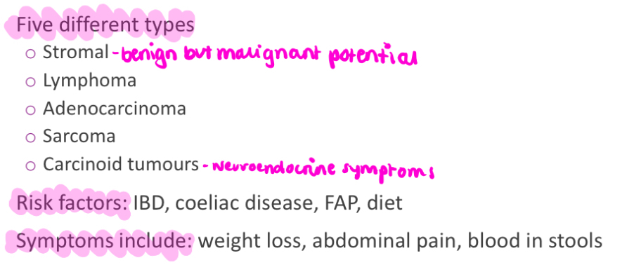 - Gastrointestinal stromal tumours: sarcomas and tend to find them accidentally on endoscopy