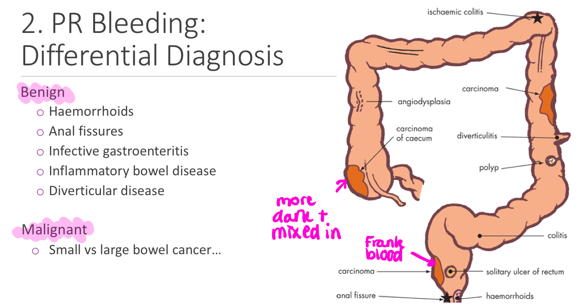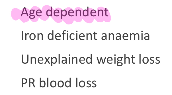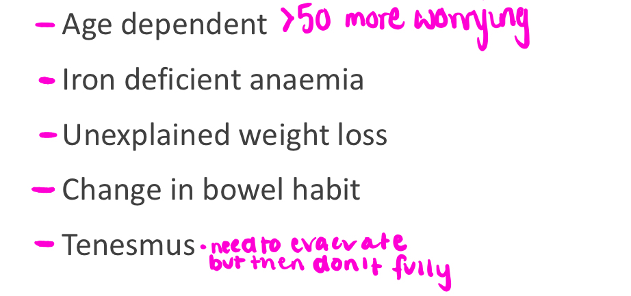 What are some red flags with PR bleeding that could suggest a bowel malignancy?
