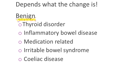 What can be some changes in bowel habit and what are some benign differentials for this?