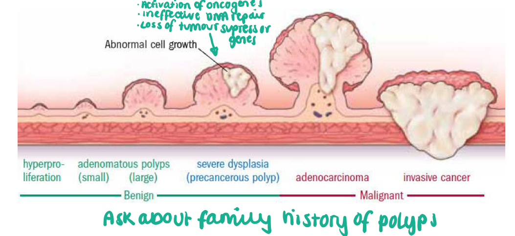 - Risks: family history, IBS, FAP, HNPCC, diet and lifestyle