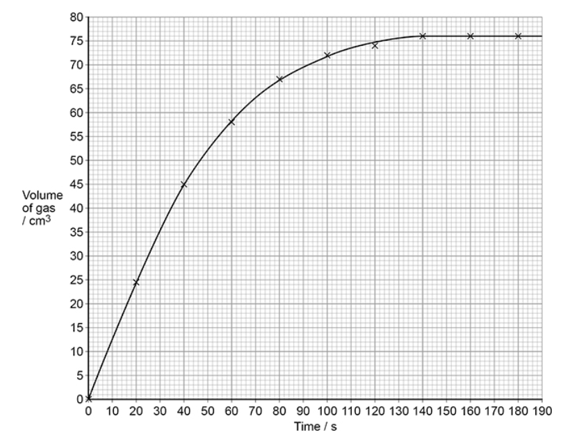 This graph is for the volume of hydrogen produced when 100 cm3 1 mol dm-3 HCl reacts with excess Mg. How will the initial gradient and final volume change if 50 cm3 1 mol dm-3 HCl is used?