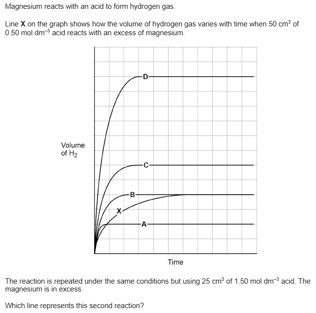 This graph is for the volume of hydrogen produced when 100 cm3 1 mol dm-3 HCl reacts with excess Mg. How will the initial gradient and final volume change if 50 cm3 1 mol dm-3 HCl is used?
