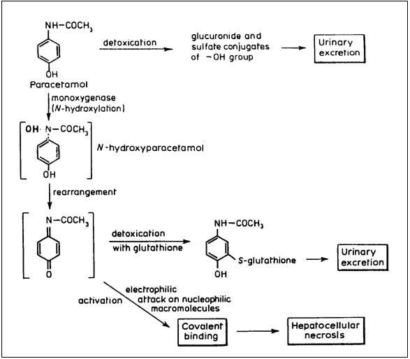Acetaminophen is hepatically metabolized to a toxic metabolite. The metabolic pathway through the P450 enzymes (N-hydroxylation) is a minor component of acetaminophen metabolism and the reactive intermediate it produces is immediately conjugated to glutathione. In overdose, more acetaminophen is available to be metabolized by the P450 enzymes to this reactive metabolite. When glutathione stores are depleted, the toxic metabolite is free to react with hepatocytes, causing a toxic hepatitis and hepatocellular death.
