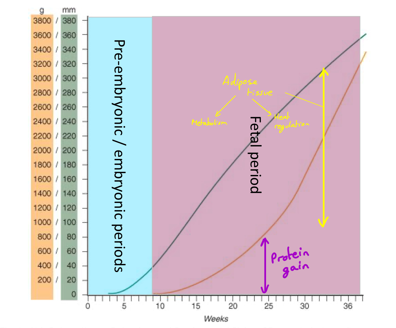 Outline how protein and adipose tissue contribute to weight gain during the fetal period.