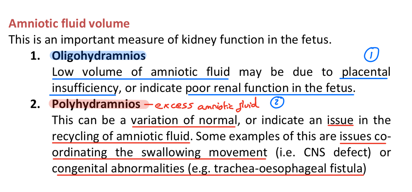 Amniotic fluid volume is used to measure kidney function in the fetus. What do the following mean and what could they indicate?: