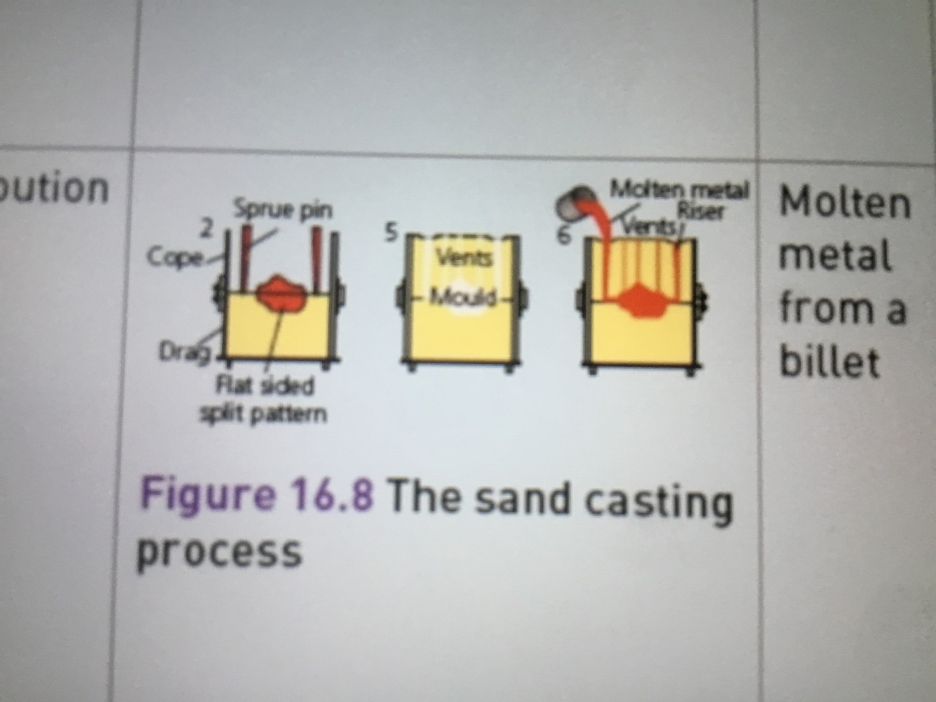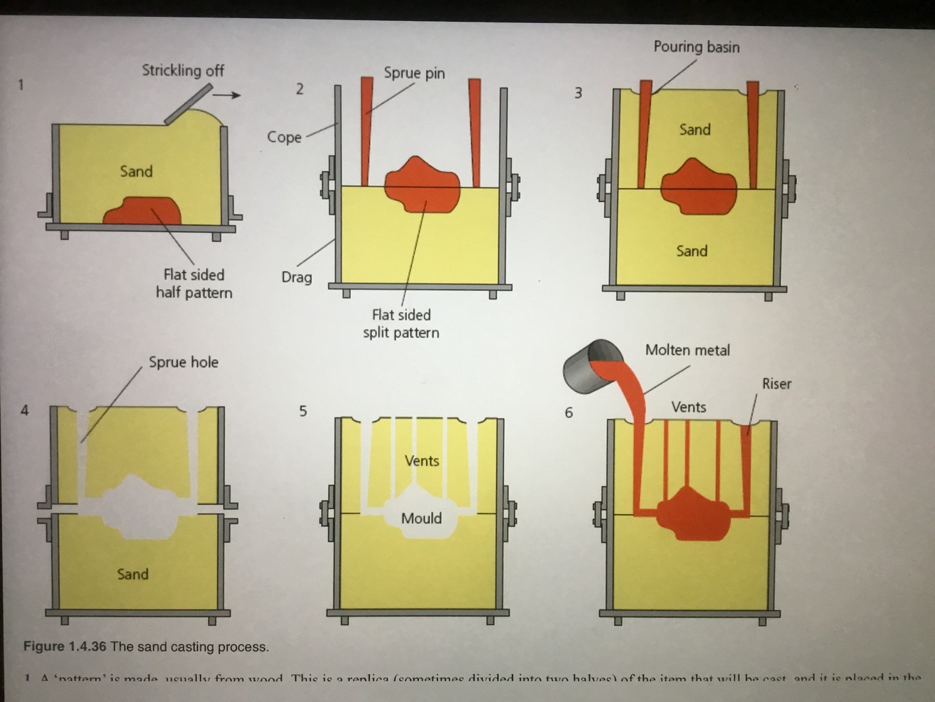 1 - a ‘pattern’ is made, usually from wood which is a replica of the item that will be cast and is then placed into a drag. The drag is then filled with sand which is packed or rammed in tight around the pattern and levelled