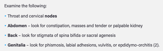Should also be considered in those with FHx of VUR, poor urinary flow or abnormal dilatation of ureter on US