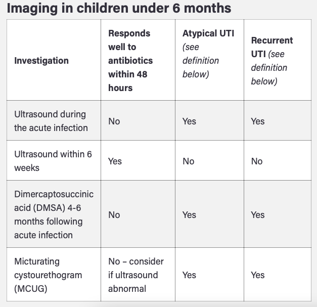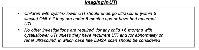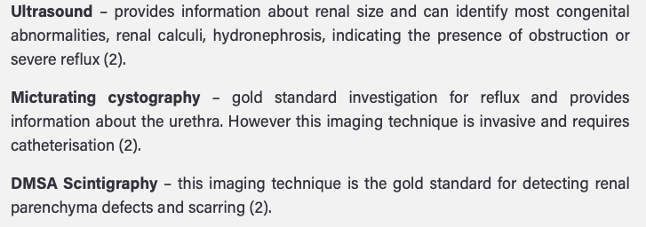 • DMSA (Dimercaptosuccinic Acid) Scan: Assess for damage after recurrent UTIs 4-6 months after infection. Inject radioactive material and a gamma camera to see how much is taken up by kidney. Patches indicate areas of scarring