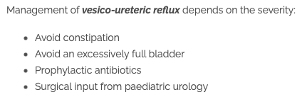 * No treatment * Follow up renal ultrasound scans * Prophylactic abx for UTI **Complications:** UTIs, hypertension and CKD