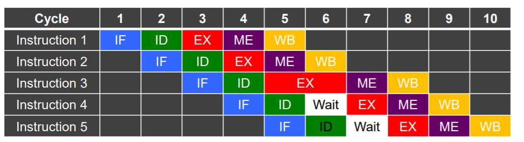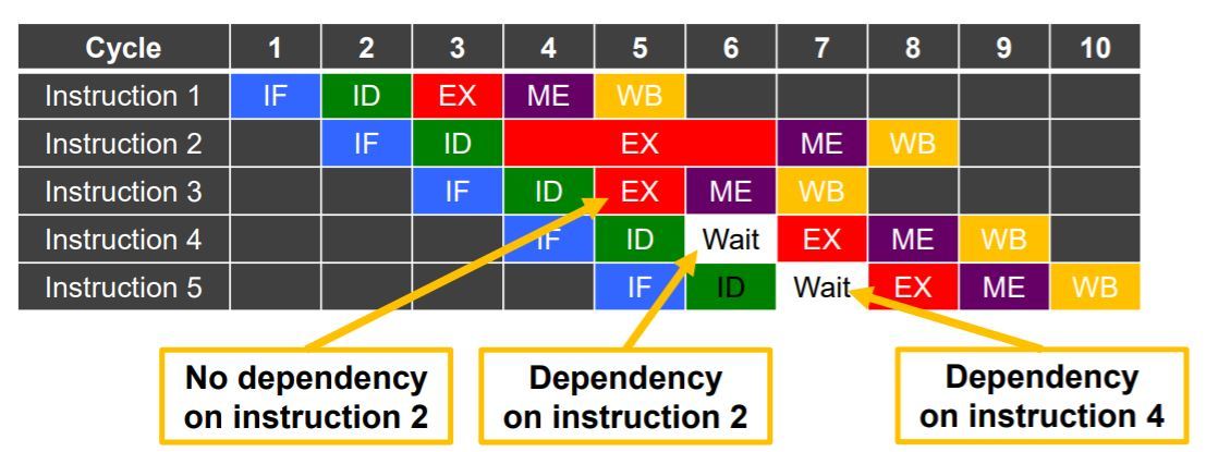 If the instructions MUST be completed in the correct order, then we need to wait for longer instructions to complete, e.g., Instruction 3 takes 2 cycles => need to wait