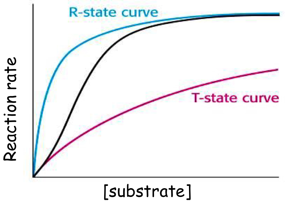 - Inhibitor: Stabilises T state, e.g 2,3 BPG, products of pathway
