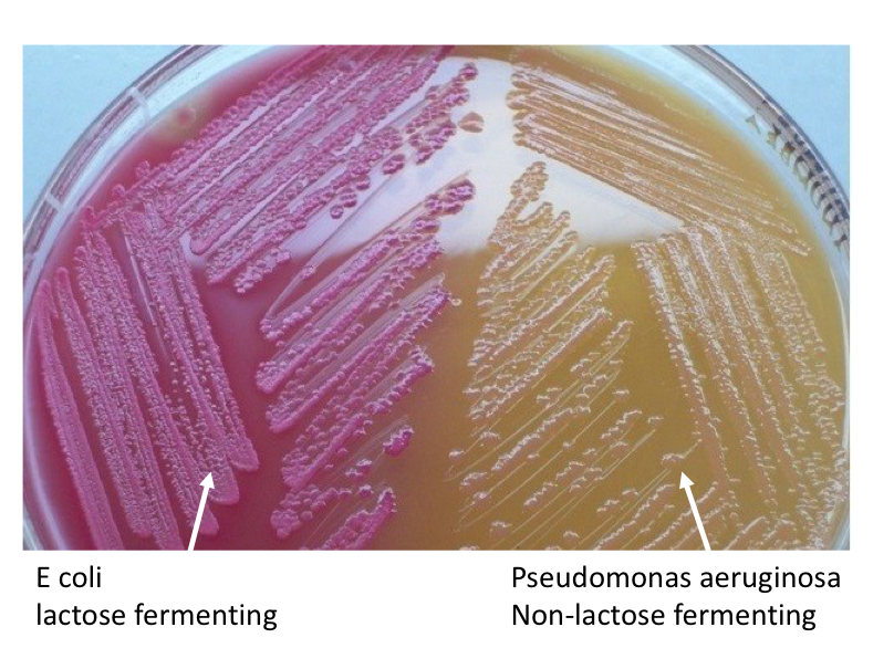 MacConkey agar containing lactose. If they use lactose they produce lactic acid and this turns the agar red as it has a low pH. If not lactose fermenting they grow yellow colonies