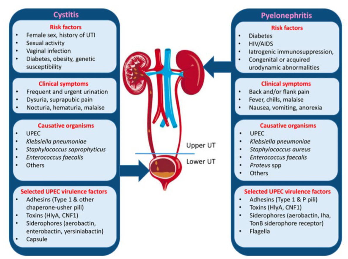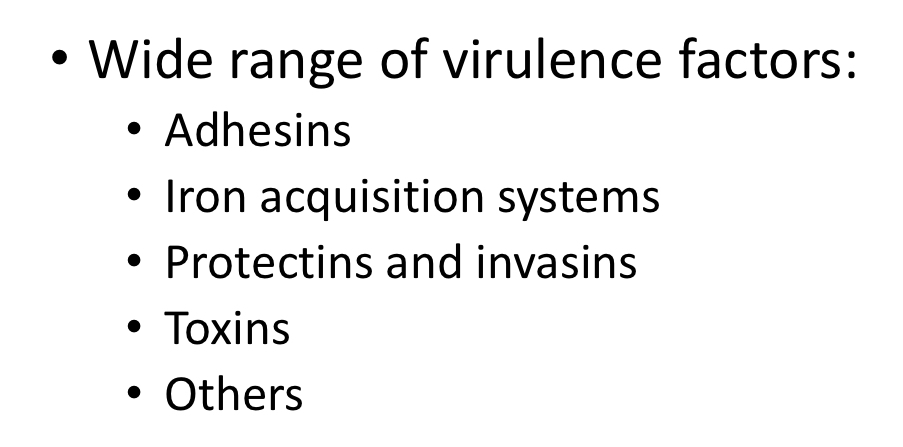 - UPC has adhesins called type 1 fimbria that can bind to uroepithelium to form communities, LPS toxin, cytotoxin alpha-haemolysin and produce siderophores to sequester iron to survive
