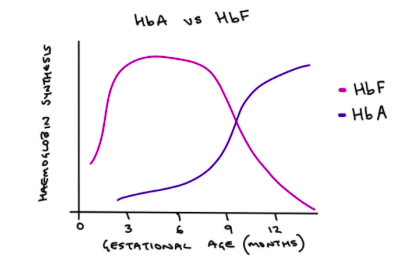 Dip in Hb around 6-9 weeks because there is high oxygen delivery to tissues at birth causing a negative feedback so EPO production by kidneys is suppressed so less Hb made by bone marrow