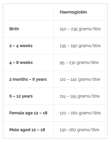 Varies depending on age but usually Hb<120