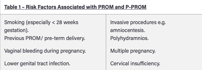 Preterm prelabour rupture of membranes (P‑PROM): The amniotic sac has ruptured before the onset of labour and before 37 weeks gestation (preterm).