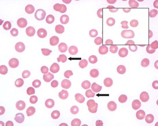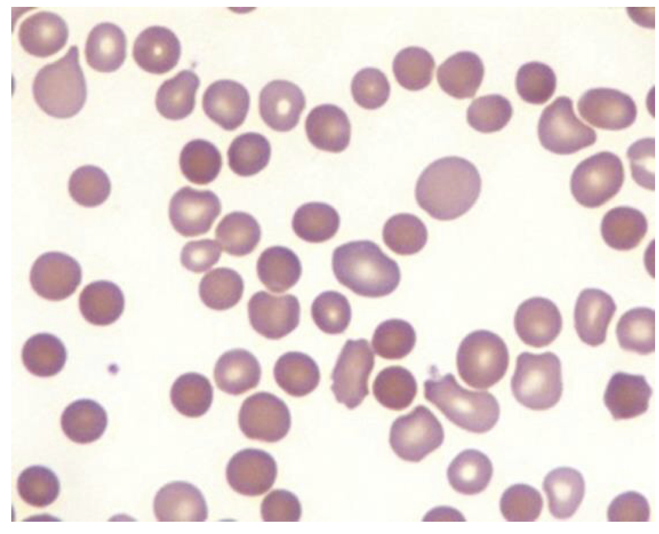 **could be hereditary spherocytosis (inherited), autoimmune hemolytic anemia, or thermal injury (acquired)