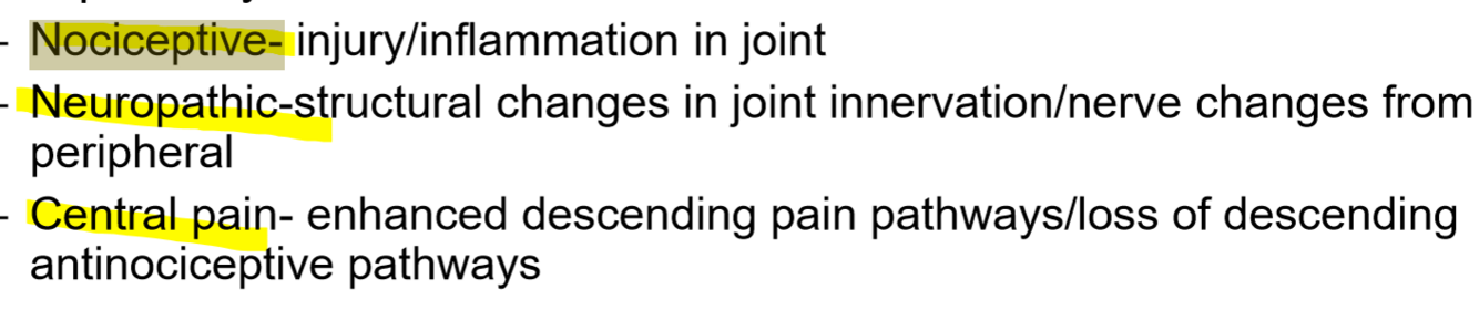 Innervated tissues—synovium, capsule, bone, tendons, ligaments; pain may be nociceptive, neuropathic, or central.