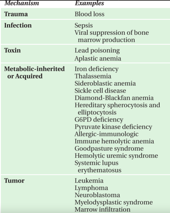 Think low RBC, WBC, platelets and the effects of that are pallor, infection and bleeding