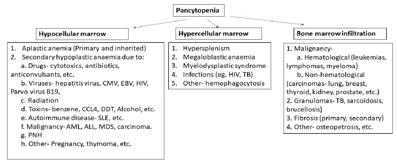 Proliferating malignant cells infiltrate and replace normal lines of haematopoietic cells in bone marrow resulting in their suppression so pancytopenia.