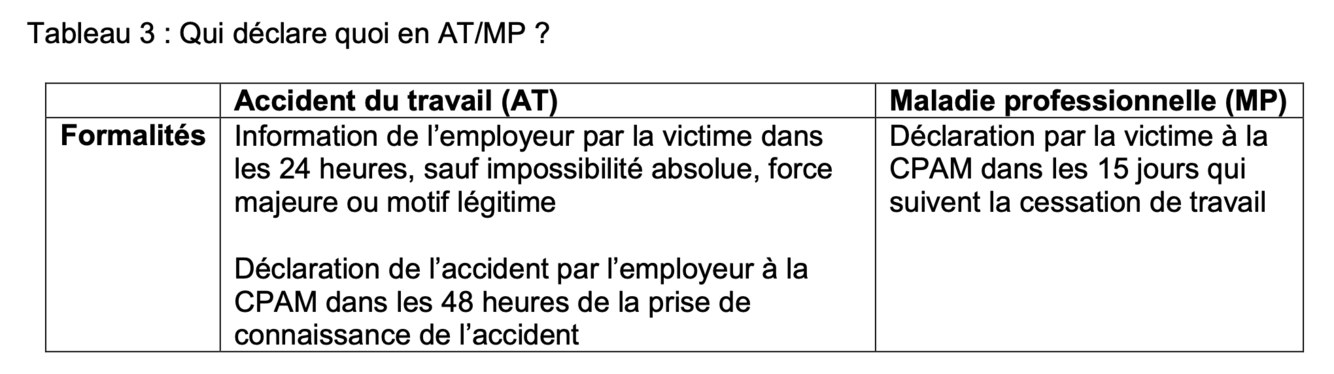 => Un AT doit être déclaré dans les 24h à l’employeur. L’employeur doit déclarer l’AT à la CPAM dans les 48h et fournir au salarié une feuille d’AT à conserver (reconnaissance d’une éventuelle maladie professionnelle ultérieure).