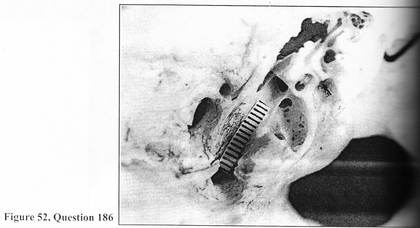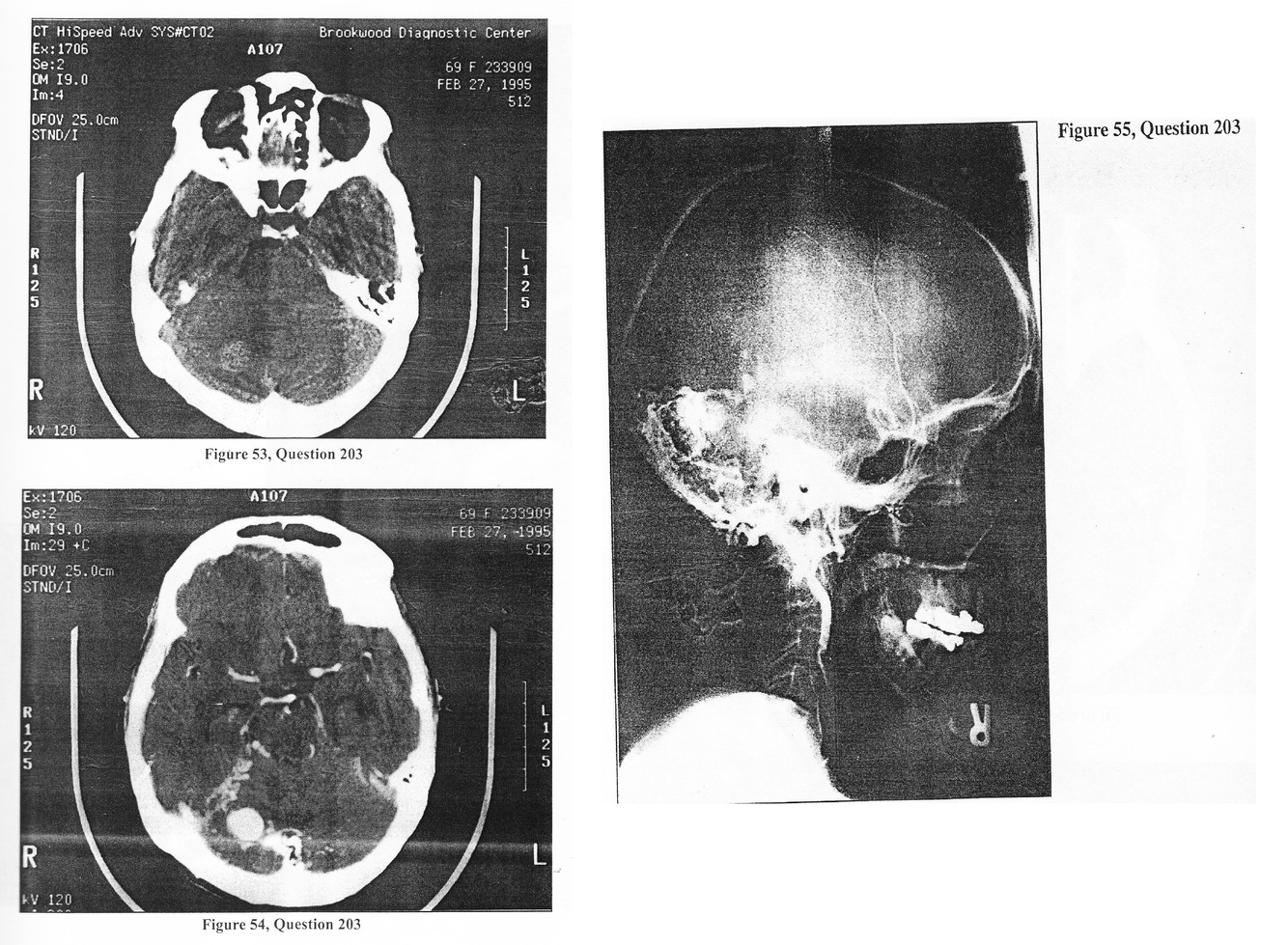 A 69-year-old right-handed female was in her usual state of health until awakening this morning with the worst headache of her life, along with a stiff neck. There had been some numbness and tingling of her arms, however, that has resolved. She presently complains of nausea without vomiting and states she has been diagnosed as having Sturge-Weber syndrome. She has never experienced any episode suggesting a seizure. Examination reveals an anxious and alert woman. Behind her right ear, there is a skin vascular anomaly which blanches slightly when depressed with the finger. There is no papilledema, and her neurologic examination is entirely normal. There is no meningismus. Her initial diagnostic management included a CT with and without contrast (Figures 53 and 54) and a lumbar puncture which was blood tinged and did not clear between tubes 1 and 4. Following admission to the hospital, an MRI and cerebral angiogram were obtained (Figure 55).