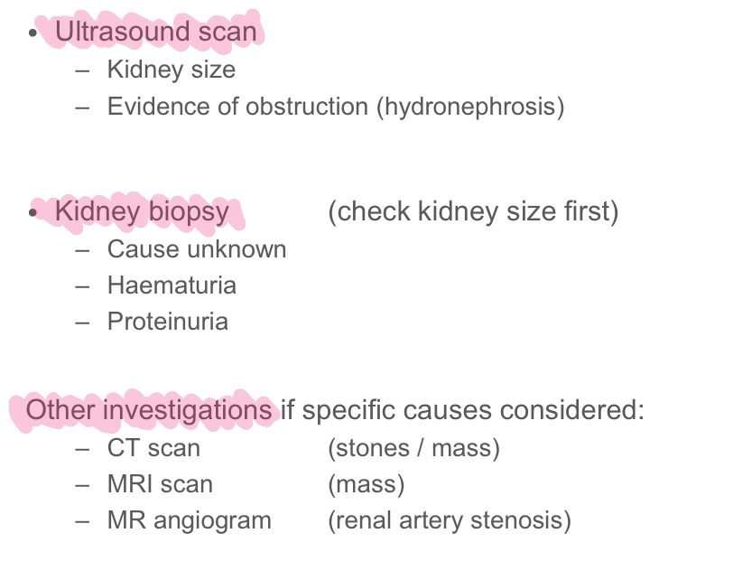 What investigations should you do into CKD?