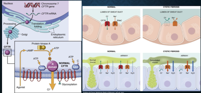 1. No funtional CFTR protein = nonsense; frameshift; canonical splice