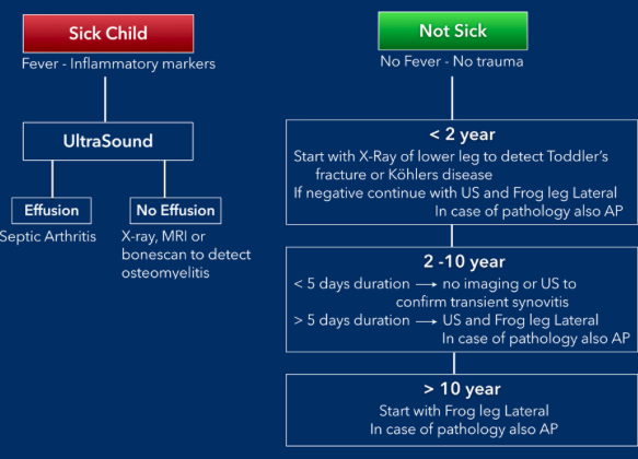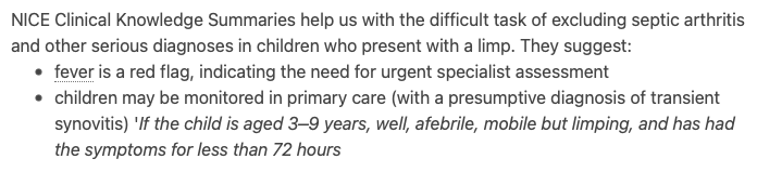 • If aged 3-9 with limp <48 hours then manage in primary care but clear safety net advice to go to A+E immediately if there is temperature. Follow up at 48 hours and then 1 week