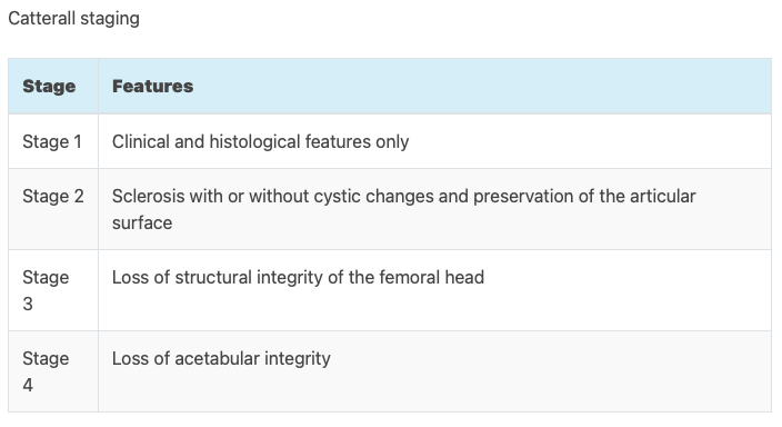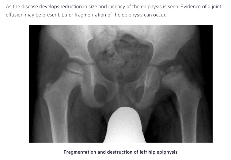 * **AP and lateral (typically frog-leg) pelvic X-ray:** diagnostic * **Other tests to exclude differentials:** FBC, CRP, Te Bone scan, CT, MRI