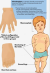 * Short limbs * Normal spine length * Short digits * Bow legs * Disproportionate skull * Foramen magnum stenosis Different areas of the skull grow by different methods, some of which are affected more than others. This leads to a ***disproportionate skull***