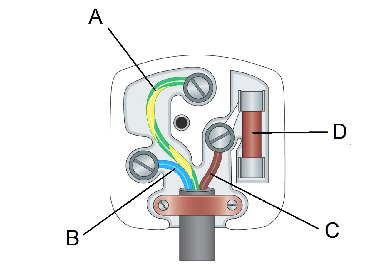 Earth wire: yellow and green stripes (labelled A in diagram)