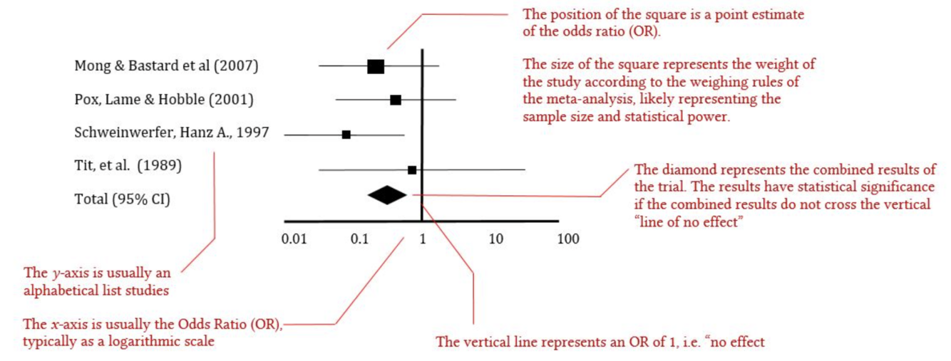 Each black box represents the point estimate (e.g., odds ratio, risk ratio, mean difference) for an individual study.