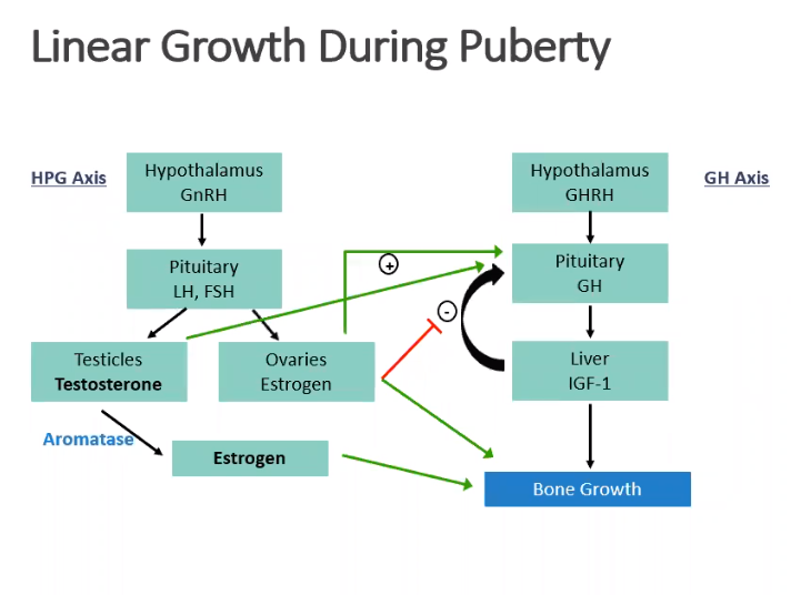 Which hormone causes fusion of the growth plate at the end of puberty?