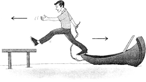 1) If a man pushes off a boat as he jumps to the land, what would happen to the boat?
