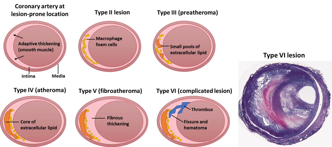 Describe the progression of atherosclerosis from coronary artery at lesion-prone location to a type VI complicated lesion