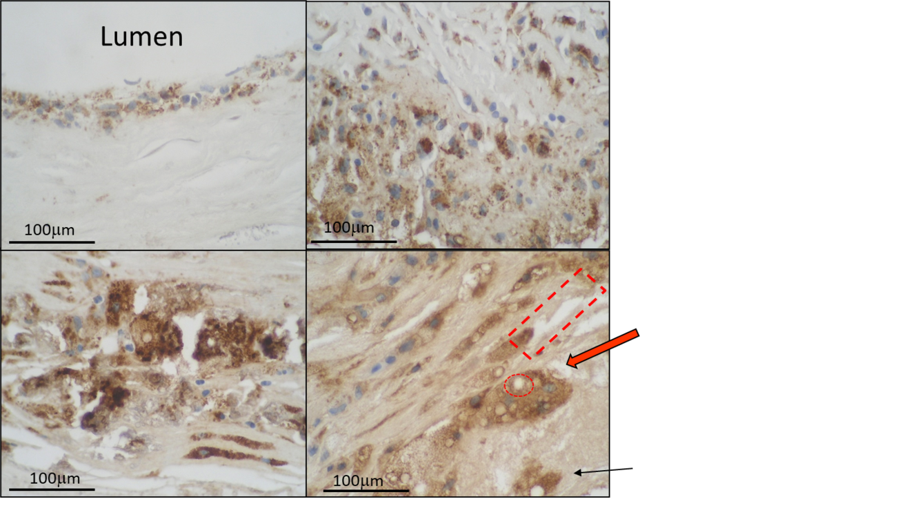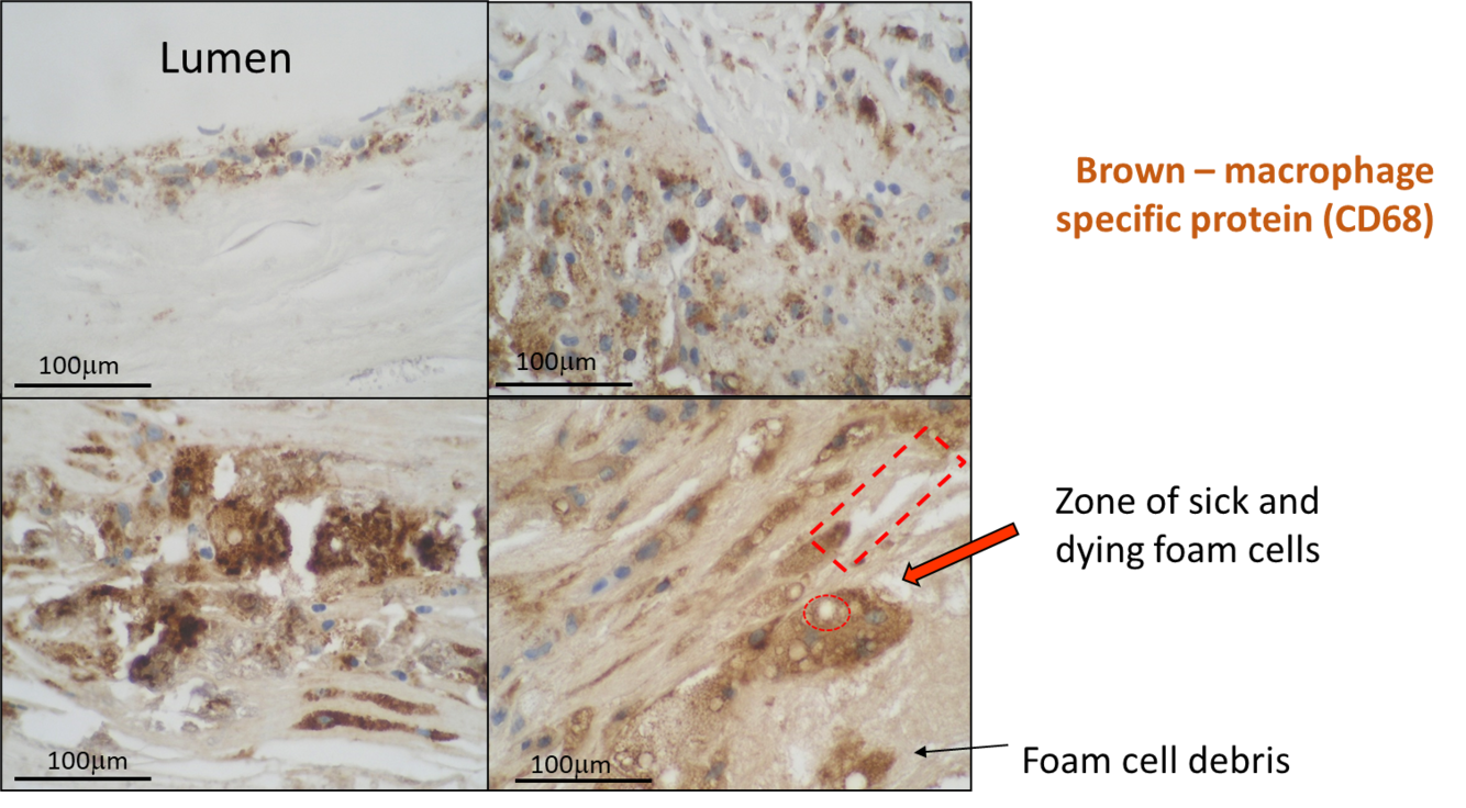 Image to show macrophages in atherosclerosis making foam cells and becoming full of fat and dying.