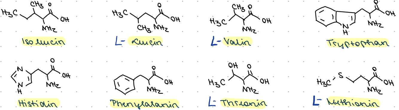 Isoleucin, Leucin, Valin, Tryphtophan, Histidin, Phenylalanin, Threonin, Methionin