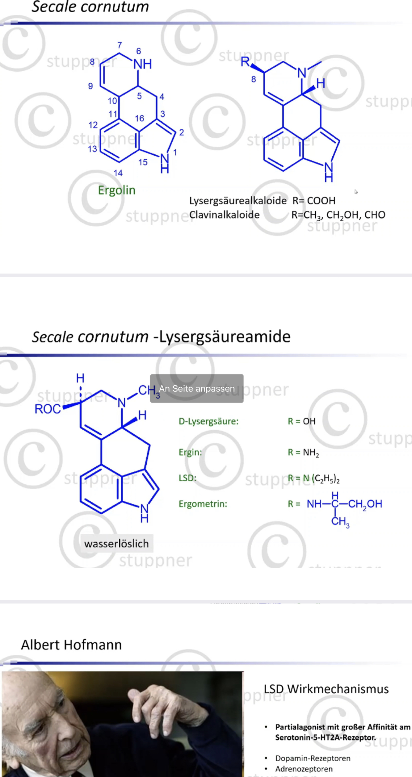 Allen mutterkornalkaloiden gemeinsamer Grundbaustein: Die Lysergsäure. Die Lysergsäure hat als GG das Ergolin-GG. Lysergsäure kann man mit basischen Resten verknüpfen. Mit Diethylamin gelangt man zum Lysergsäurediethylamid. Durch Albert Hofmann zu dieser Zeit bei Sandoz.