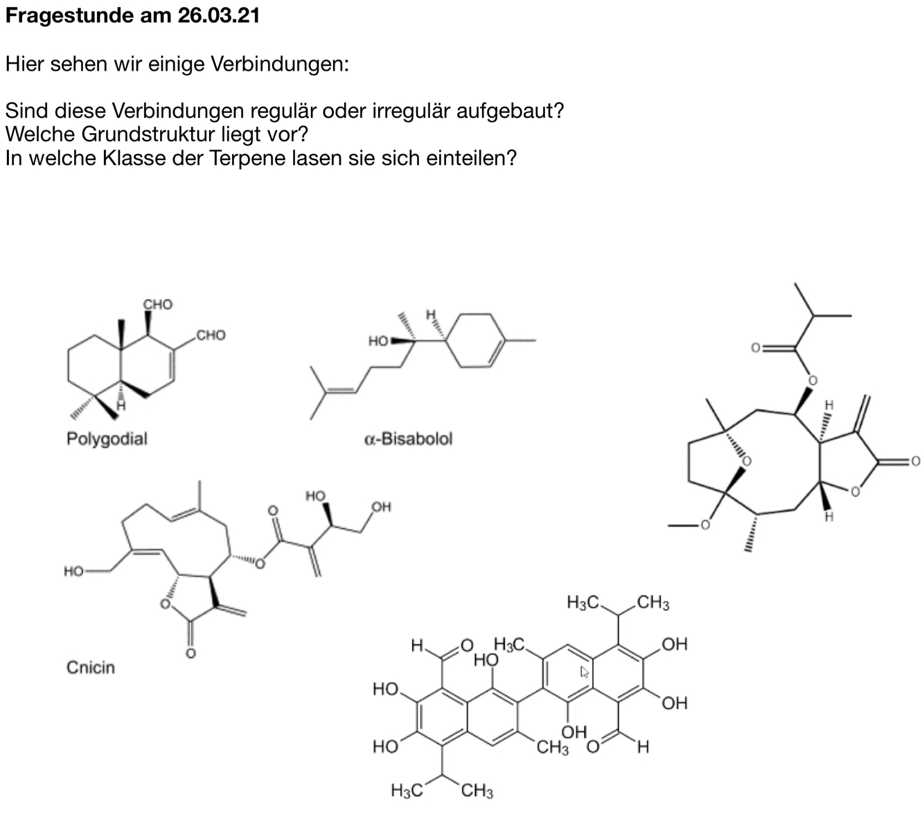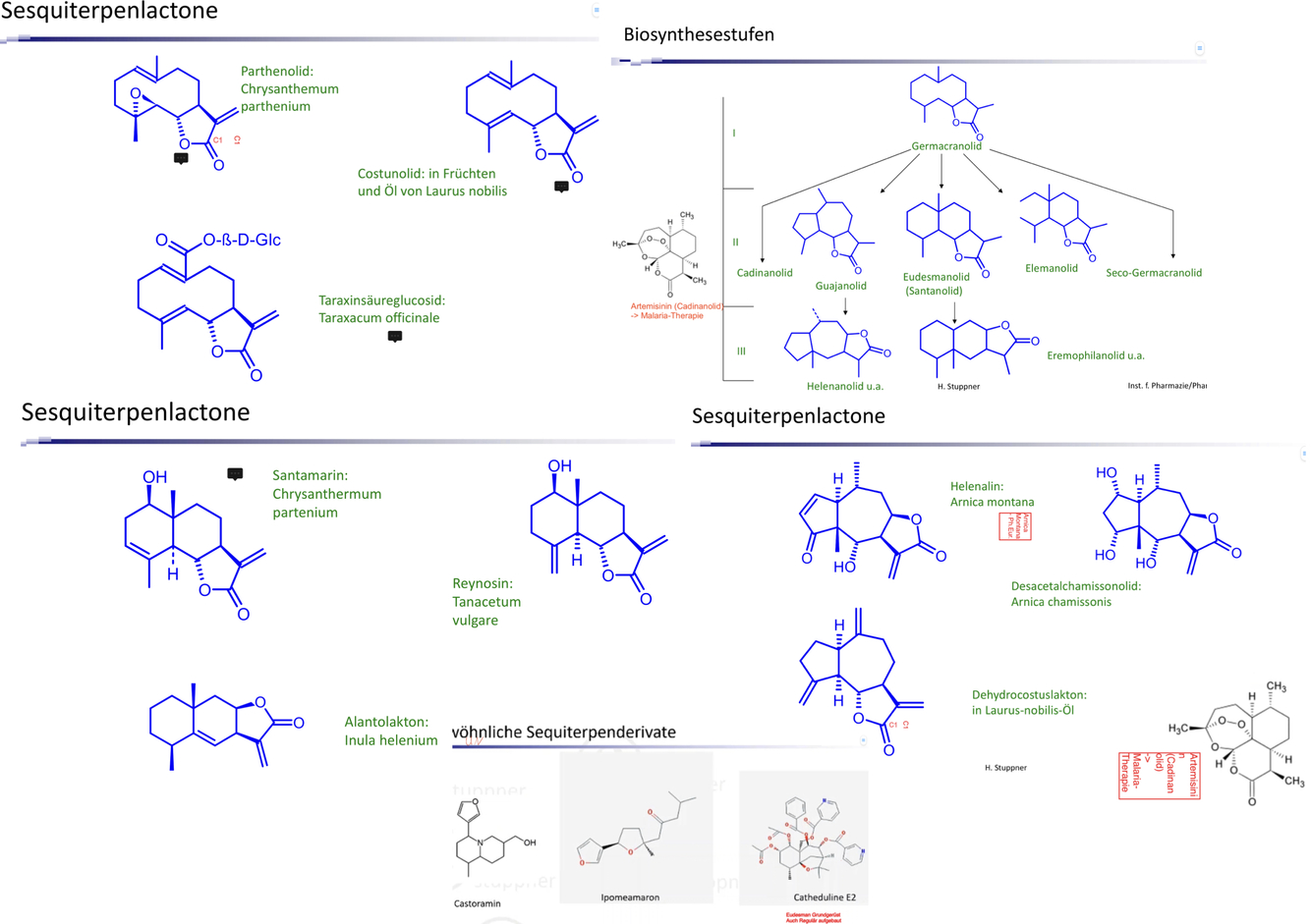 Sesquiterpenlactone, alle 3 mit Grundstrukturen (Er wollte auch canin). Dann Parthenolid zeichen, Wkg erklären und für was es verwendet wird , Mutterkraut bei welchen Krankheiten