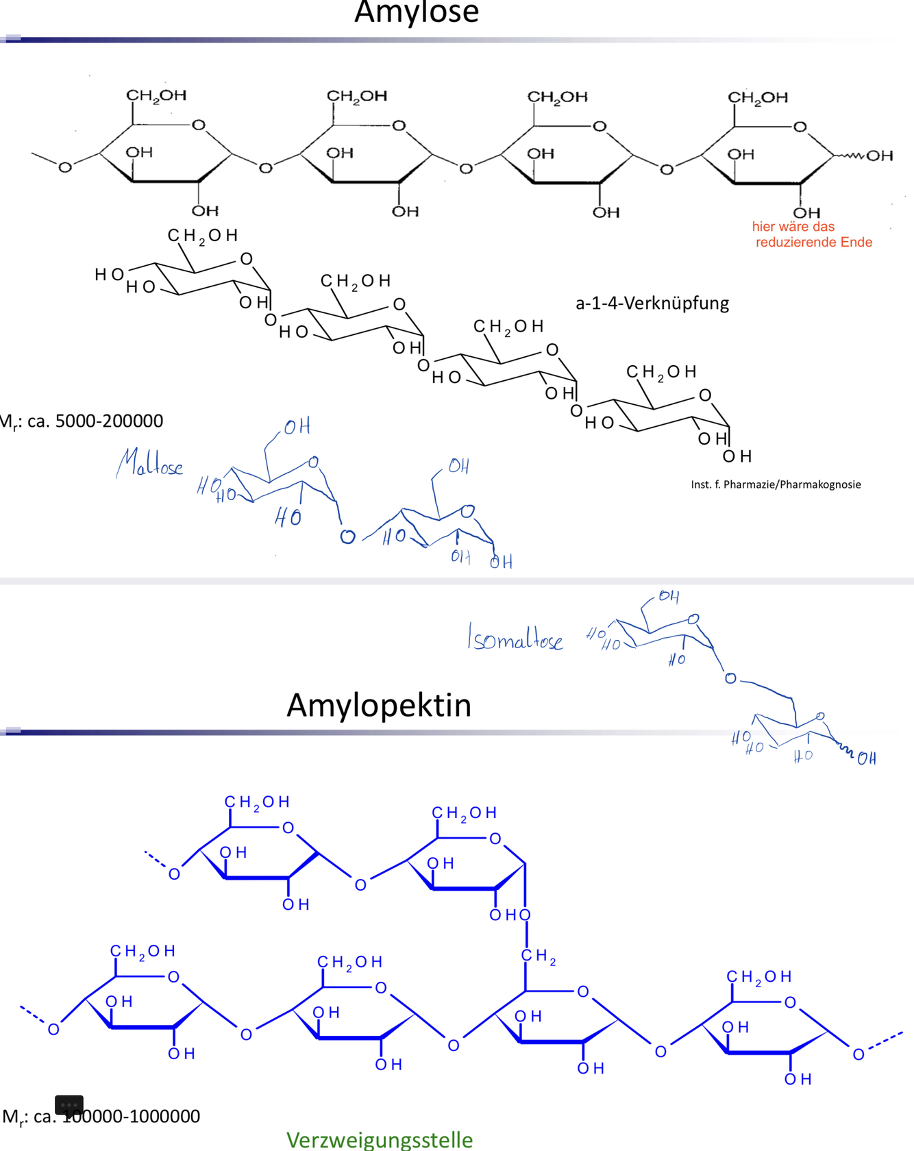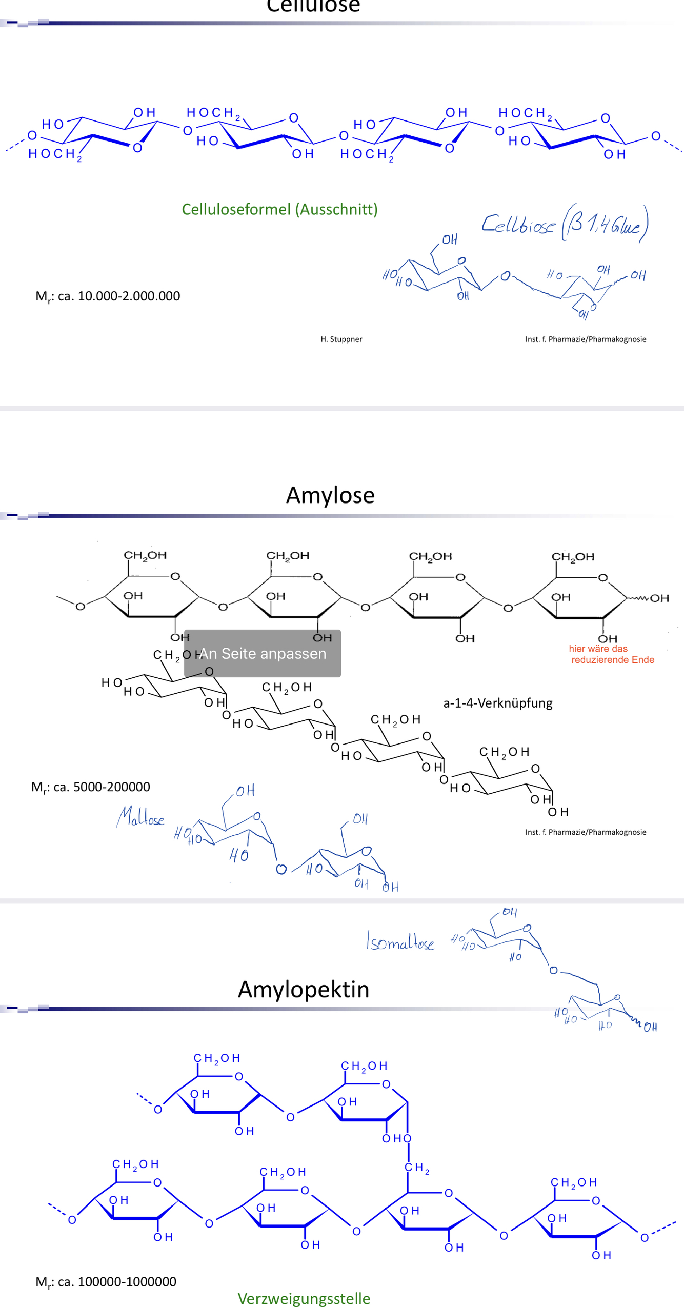 alles zu Stärke; Aufbau: warum helikale Struktur? Wie wird Iod genau eingelagert? Und warum ergibt das überhaupt eine Farbe, wie entseht die blaue Farbe? Die Notizen, die dazu im Studienskript sind haben ihm nicht ausgereicht; Abbau: was entsteht da und was ist das?