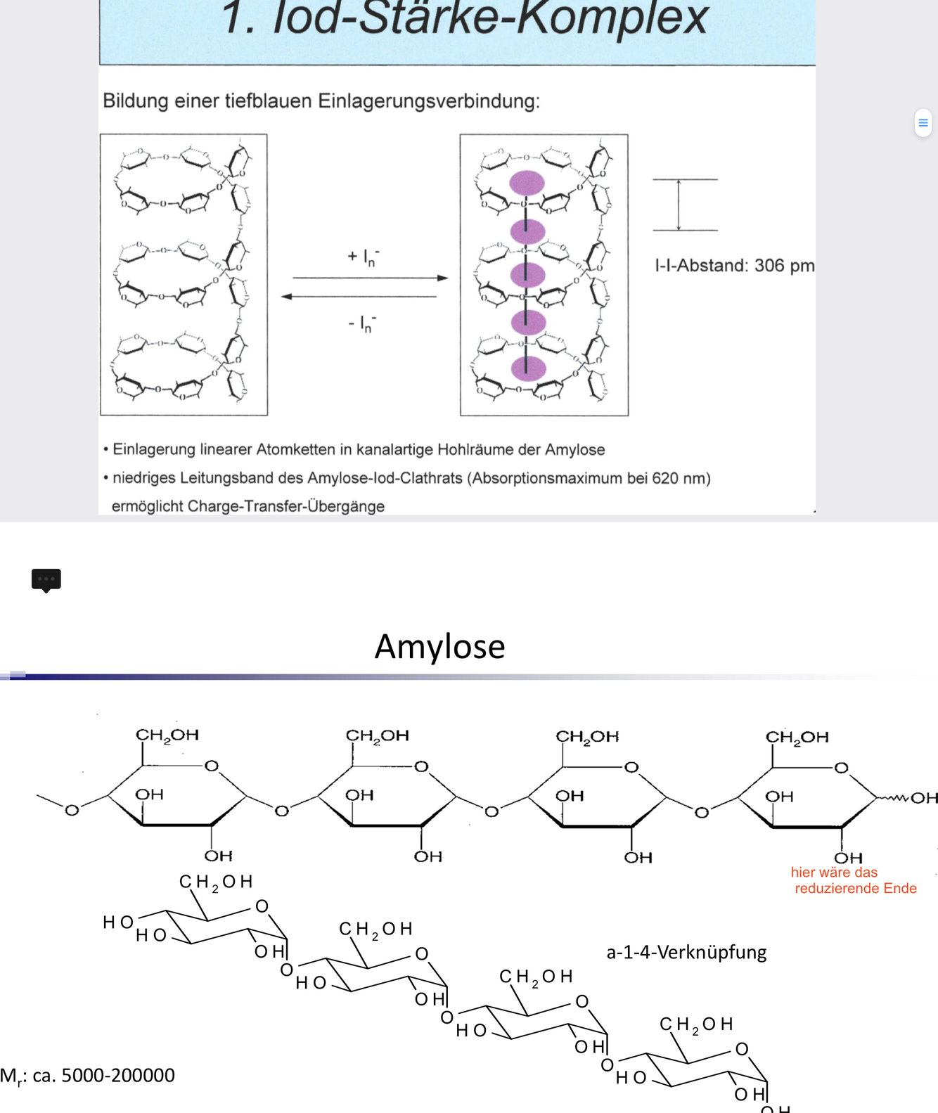 Der Aufbau der Amylose ist nicht Fadenförmig sondern Spiralige Struktur mit 6 Glucose-Einheiten pro Windung. Spiralige Sturktur schließt einen Kanalartigen freien Raum ein mit einem Durchmesser von 6nm, Passende Moleküle wie Iod können darin eingelagert werden. Bei Iod kommt es durch diesem Einbau in den Kanal zu einer lockerung der Elektronensysteme (ermöglicht Charg-Transfer-Komplex Übergänge) wodurch es zu einer intensiven blaufärbung (bathochrome verschiebung in Längerwelligenbereich ca. 620nm)kommt.