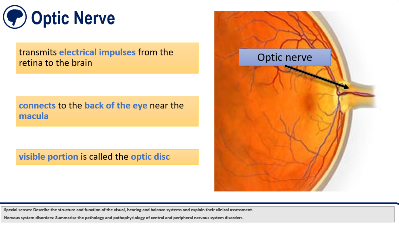 What does the optic nerve do and where is it?