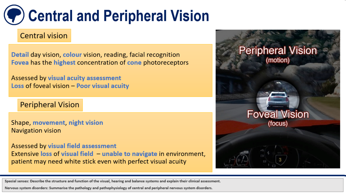 Unable to navigate in environment, patient may need white stick even with perfect visual acuity