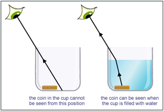 This causes the light to bend- if an object is seen through water, it is not directly in a straight line path but its image appears that way- the actual object is on either side of the image being viewed