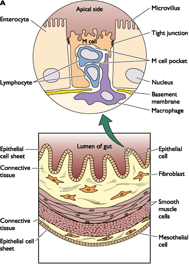 M cells sample the gut contents and present it to underlying immune cells. Viruses can infect M cells and easily reach the blood stream.