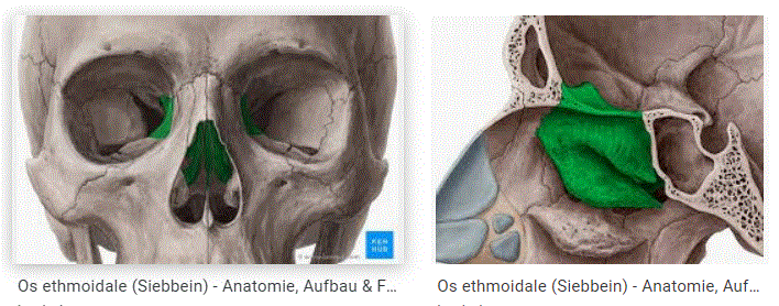 Das Os ethmoidale ist an der Bildung der Schädelhöhle, der Nasenhöhle und der Orbita beteiligt. Der Knochen lässt sich in 4 Abschnitte gliedern: die Lamina cribrosa, die Lamina perpendicularis und das paarige Labyrinth (Labyrinthus ethmoidalis).