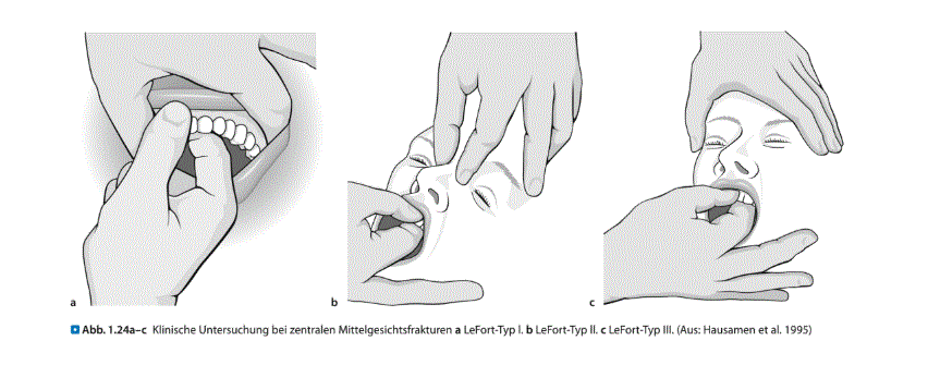 Wie erfolgt klinische Untersuchung bei Verdacht auf MG-Fraktur (Lefort 1,2,3)