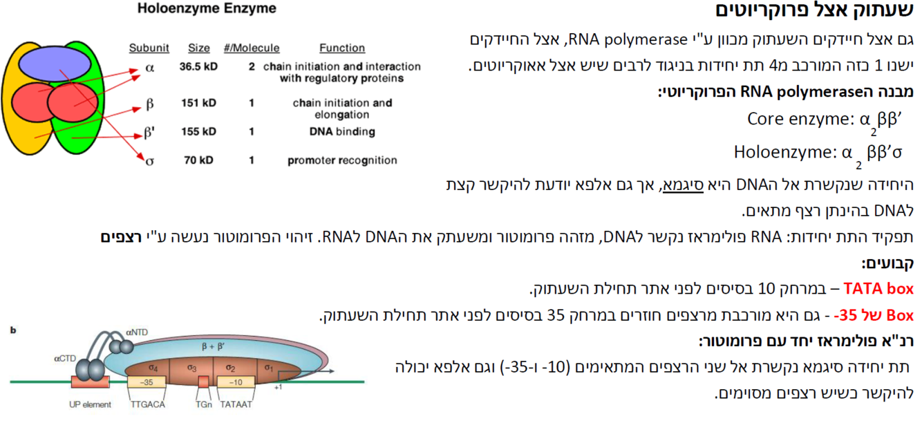מאיזה תת יחידות מורכב הרנא פולימרז הפרוקריוטי? איזו יחידה נקשרת לדנא? איפה נמצאים הרצפים הקבועים אליו נקשר הפולימרז?