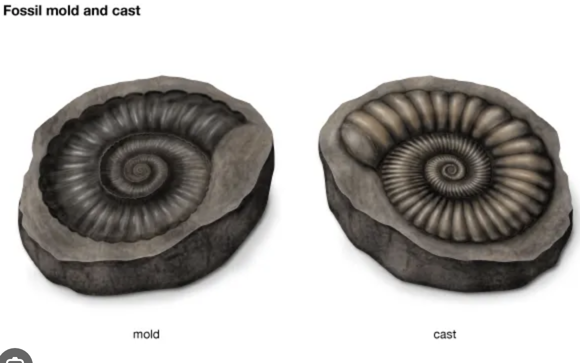 A cast forms when minerals and sediment deposit into a mold and hardens over time, resulting in a three-dimensional physical replica of the hard structures of the organism